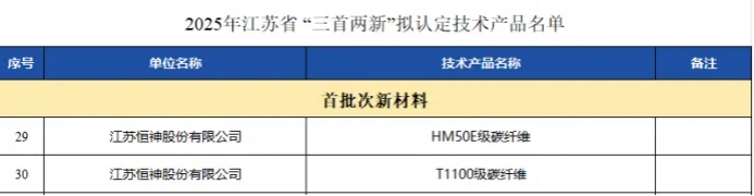 近日,江苏省工信厅正式公示2025年度“三首两新”拟认定技术产品名单,恒神股份自主研发的T1100级碳纤维、HM50E级碳纤维成功入选首批次新材料名单,占全省33项中的两项。此外,EM817C预浸料成...